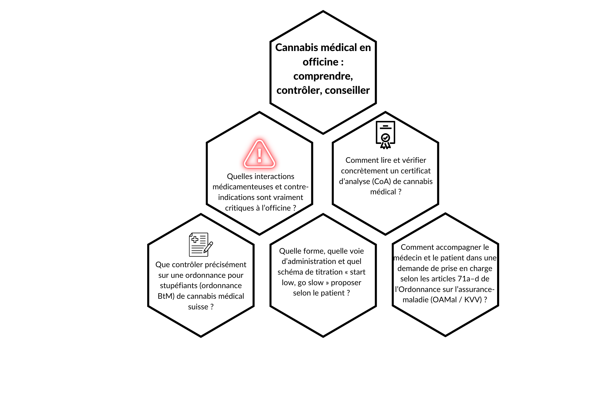Découvrez les interactions pertinentes via le cytochrome P450 et les risques de sédation additive avec opioïdes, benzodiazépines et autres psychotropes. Apprenez à vérifier une ordonnance de cannabis médical, à soutenir le médecin pour les demandes de prise en charge selon les articles 71a–d de l’Ordonnance sur l’assurance-maladie.