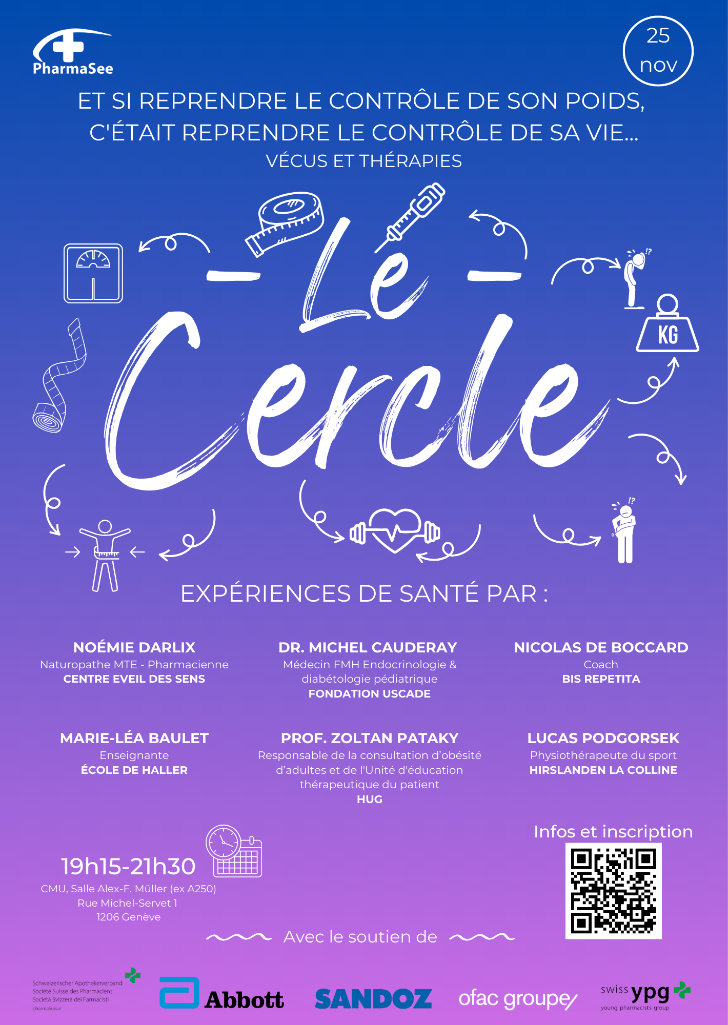 Que vous soyez pharmacien-ne, médecin, assistant-e en pharmacie, infirmi-er-ère, nutritionniste, physiothérapeute, patient-e ou simplement curieux-ses entrez dans le Cercle et venez discuter et partagez un apéritif avec nos invité-e-s dans une chaleureuse ambiance.